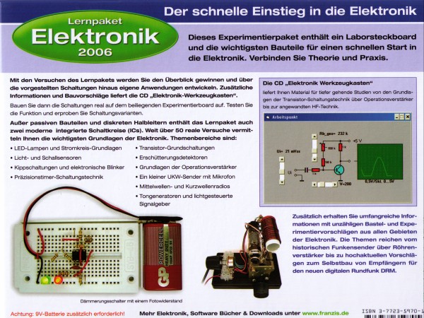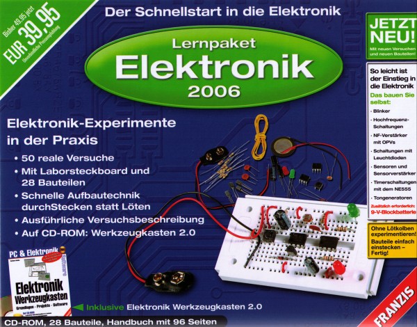 Dieses Lernpaket wurde zusammengestellt, um Ihnen die wichtigsten Grundlagen der Elektronik vorzustellen. Was nutzt alle graue Theorie ohne die Praxis! Deshalb wurde außer der geeigneten Software auch ein Experimentierpaket mit den wichtigsten Bauteilen gepackt. Schnell werden Sie den Überblick gewinnen und über die vorgestellten Schaltungen hinaus eigene Ideen entwickeln und erproben. Zur Durchführung der Experimente benötigen Sie eine 9-V-Blockbatterie, die aus Gründen der unbestimmten Lagerungszeit nicht im Lernpaket enthalten ist.