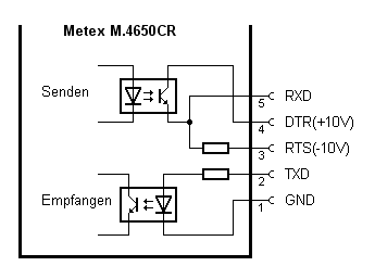 Das Gerät ist durch Optokoppler vollständig vom Übertragungskabel isoliert, sodass auch an hohen Spannungen gemessen werden kann. Der PC steuert über TXD die Sendediode eines Optokopplers an. Der Empfangskanal erhält über die Schnittstelle eine bipolare Versorgungsspannung von ±10 V. Dazu muss DTR hochgesetzt und RTS zurückgesetzt werden.
