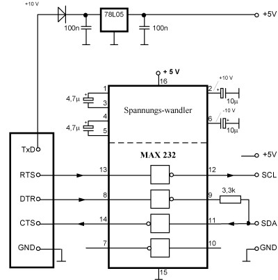 Bei der Anwendung des I2C-Bus in Kapitel 6 hat sich ein Fehler eingeschlichen. Die Pegelanpassung nach Abb. 6.17 funktioniert so nicht, weil es zu Verwechselungen der IC-Anschlüsse gekommen ist. Hier die korrekte Schaltung: