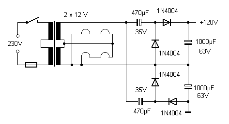 Der Netztrafo hat zwei Wicklungen mit 12 V. Er sollte die Heizspannung und zugleich auch die Anodenspannung liefern. Mit einer Spannungsvervierfachung werden aus 24 V Wechselspannung 120V Gleichspannung erzeugt. Das ist für eine EL95 nicht gerade viel. Eine Endstufe im reinen A-Betrieb würde zu wenig Ausgangsspannung liefern. Deshalb wurde hier eine einfache Gegentaktstufe für AB-Betrieb entwickelt (vgl. Gegentakt-AB mit EL504).