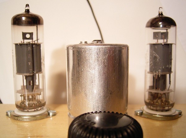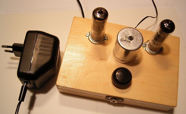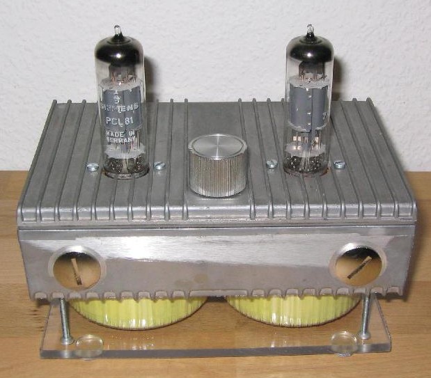 Jogi hat mal zwei PCL81 gestiftet, die sind echt schön. Außerdem brauchen sie 12 V Heizung. Wenn man da beide in Reihe schaltet, sind es 24 V. Genau wie mein kleiner Steckertrafo. Der Verstärker passt insgesamt in eine kleine Bohrerschachtel, die noch rumlag.