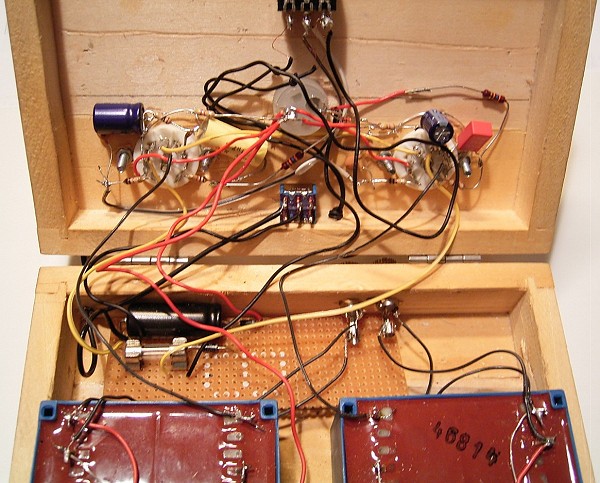 Im Gehäuse befinden sich die beiden Ausgangsübertrager, wie man sieht einfache Netztrafos. Es waren 30-Watt-Typen mit 2 mal 115 V und 2 mal 12V/1,25 A. Die Verdrahtung ist fliegend aufgebaut. Bei so kleinen Spannungen kann man sich das leisten.