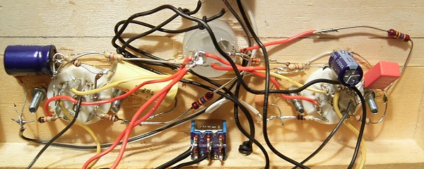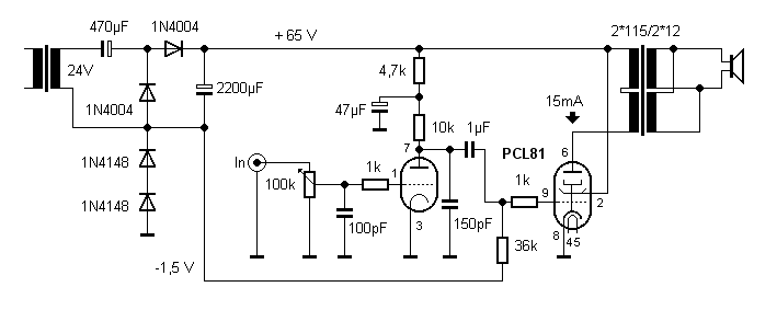 Die PCL81 zeigte eine Besonderheit. Der Gitterstrom an der Pentode setzt so markant ein, dass das Gitter sich negativ auflädt und den Arbeitspunkt verschiebt. Das gab zuerst hässliche Verzerrungen. Mit einem relativ kleinen Ableitwiderstand von 36 kW und einer negativen Gittervorspannung von 1,5 V wurde es besser. Weil die Triode sich mit der Pentode eine Kathode teilt, konnte die Vorspannung nicht über einen Kathodenwiderstand erzeugt werden. Die Lösung waren zwei zusätzliche Dioden im Netzteil mit einem Spannungsabfall von zusammen 1,5 V.