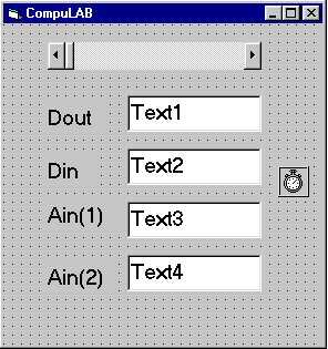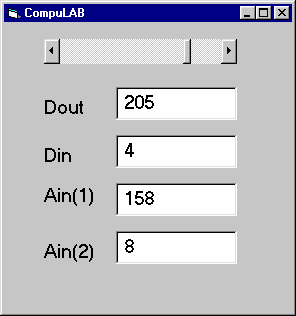 Private Sub Form_Load() INITCOMPULAB 2 ' FINDHARD 1 End Sub Private Sub Form_Unload(Cancel As Integer) CLOSECOM End Sub Private Sub Timer1_Timer() Ausgabe = HScroll1.Value Text1.Text = Str$(Ausgabe) DOUT Ausgabe Text2.Text = Str$(DIN()) Text3.Text = Str$(AIN(1)) Text4.Text = Str$(AIN(2)) End Sub