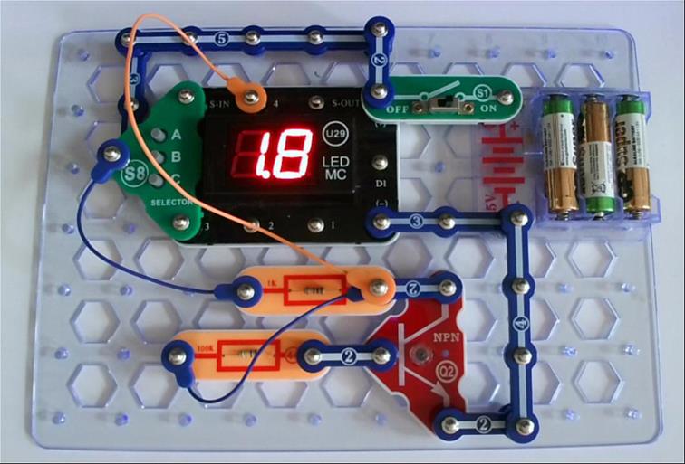 Dieser Baukasten enthält einen Mikrocontroller mit LED-Anzeige. Man kann zwischen ganz unterschiedlichen Programmen wählen, wobei die meisten elektronische Spiele sind. Vor dem Spaß kommt die Arbeit: Zu jedem Spiel muss man die passende Schaltung aufbauen. So ganz nebenbei geht es auch um die Elektronik. Selbst wer eigentlich nur spielen will, kennt am Ende die Bauteile und versteht die Schaltungen. Einige Versuche gehen tiefer in die Elektronik. Der Mikrocontroller enthält dazu spezielle Programme, darunter ein einfaches Voltmeter. Damit werden einfache Stromkreise untersucht. Der Versuch 35 geht noch weiter und untersucht einen Transistor.