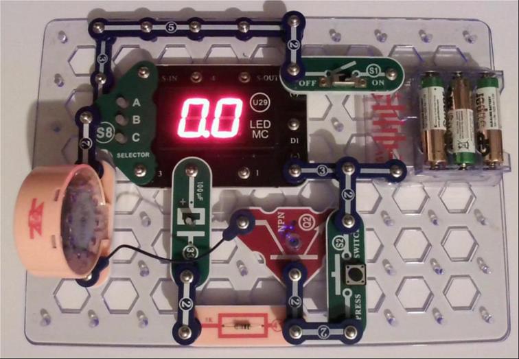 Um die Funktion der Schaltung zu verstehen, muss man wissen, dass der Transistor zwischen Basis und Emitter eine Diode enthält. Der Strom fließt nur in einer Richtung. Deshalb lädt sich der Kondensator immer weiter auf, wobei die mittlere Spannung an der Basis immer negativer wird. Der Basisstrom wird immer kleiner, bis er ganz verschwindet. Die Lautstärke nimmt daher ähnlich ab wie die Kondensatorspannung im Versuch 44. Wenn man aber den Taster betätigt, wird die Basis kurzgeschlossen und der Kondensator entladen. Mit dem Loslassen des Tasters beginnt deshalb ein neuer Ton.