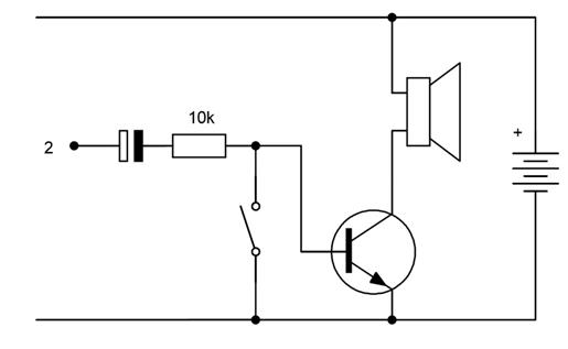 Das Rechteck-Signal wird hier über den Elko und einen Widerstand auf die Basis des Transistors geleitet. Der Ton wird dann durch den Transistor verstärkt. Er beginnt laut und wird dann zunehmend leiser. Es hört sich an wie ein Gong oder eine angeschlagene Gitarrensaite. Der Ton klingt ganz langsam aus.