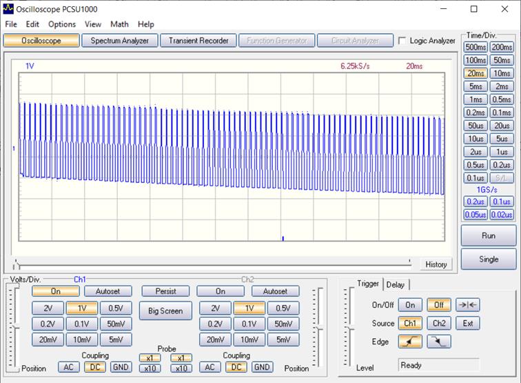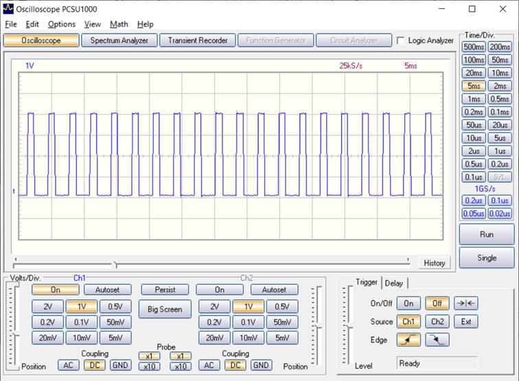 Hier werden die Signale mit einem Oszilloskop untersucht, um alles noch genauer zu verstehen. So ein Gerät misst Spannungen und zeichnet daraus ein Diagramm, ähnlich wie es im Handbuch für die Kondensatormessungen gezeigt wurde, aber viel schneller.