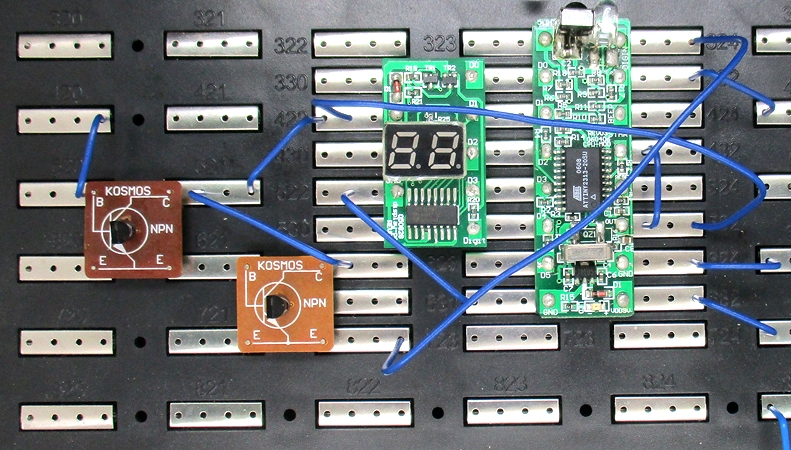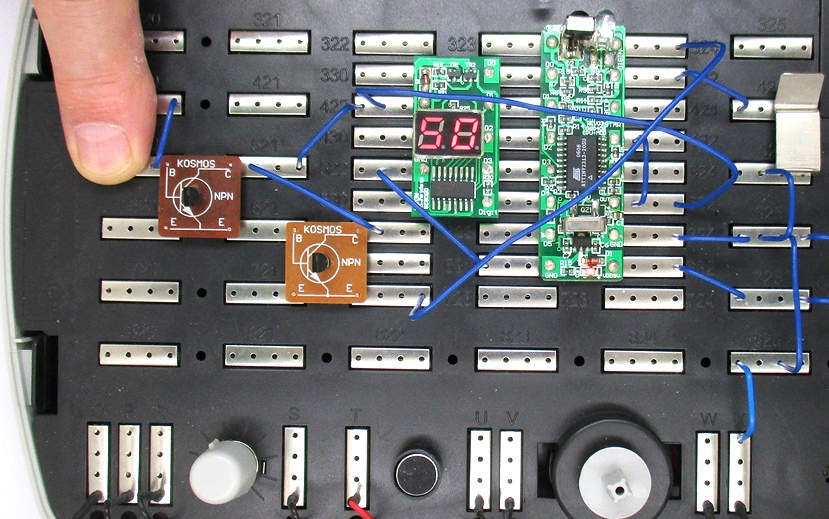Im europäischen Stromnetz hat der Wechselstrom eine Frequenz von 50 Hz, das heißt es gibt 50 Schwingungen pro Sekunde. Alle Elektrizitätswerke arbeiten hart daran, dass diese Frequenz so genau wie möglich eingehalten wird. Du kannst das ohne eine Verbindung zur Steckdose überprüfen, indem du einfach deinen Finger auf den Basis-Kontakt des linken Transistors legst. Dein Körper fängt immer etwas von der Netzspannung auf, wenn es Kabel in der Nähe gibt.