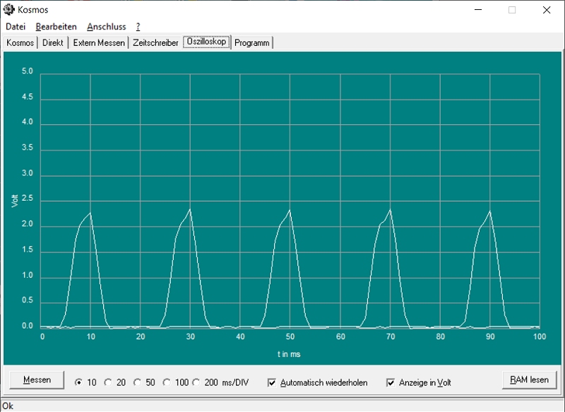 Im ersten Versuch wird das Oszilloskop des Mikrocontrollers eingesetzt, um die Schwingungen sichtbar zu machen. Man sieht hier nur den oberen Teil der Welle. Das Oszillogramm zeugt deutlich, dass die Schwingungen einen Abstand von 20 Millisekunden haben. 50 Schwingungen brauchen also 50 * 20 ms = 1000 ms = eine Sekunde. Damit ist die Frequenz 50 Hz bewiesen.