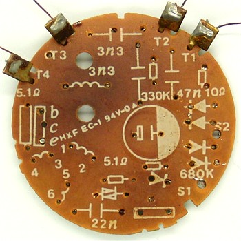 Wie dem auch sei, die Lampe enthält viele wertvolle Bauteile. Das beste ist der Elko mit 4,7 µF, 350 V, der zum Beispiel für einen Röhrenverstärker zu gebrauchen ist. Näheres über die anderen Bauteile verrät vielleicht ein kompletter Schaltplan. Ich habe mir immer schon mal vorgenommen, eine solche Schaltung abzuzeichnen. Es ist relativ kniffelig. Deshalb versuche ich es mit einer Fotomontage aus Unterseite und Oberseite der Platine.