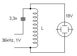 Und was ist mit der großen Spule? Es handelt sich um eine reine Luftspule, also ohne irgendeinen magnetisierbaren Kern. Die Induktivität findet man mit einer Resonanzmessung. In diesem Fall wurde ein Tongenerator mit einer Ausgangsspannung von 1 V verwendet. Bei 36 kHz gab es eine deutliche Resonanz. Am heißen Ende des Schwingkreises fand sich eine Spannung von 18 V. Daraus ergibt sich eine Induktivität von L = 6 mH und eine Güte von Q =18. Im normalen Betrieb könnte sich die Spannung von ca. 300 Vss am Ausgang des Oszillators theoretisch bis auf ca. 5,4 kV aufschaukeln. Allerdings hat dann die Leuchtstoffröhre schon gezündet und begrenzt die Spannung.