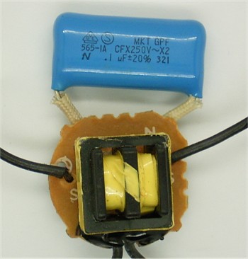 Das Entstörfilter auf der kleinen Zusatzplatine im Schraubsockel der Lampe ist auch nicht schlecht. Der 0,1-µF-Kondensator ist vom VDE für den direkten Anschluss am Netzt freigegeben. Und die Doppel-Drossel ist möglicherweise auch als Übertrager mit besonders guter Isolation zu verwenden.