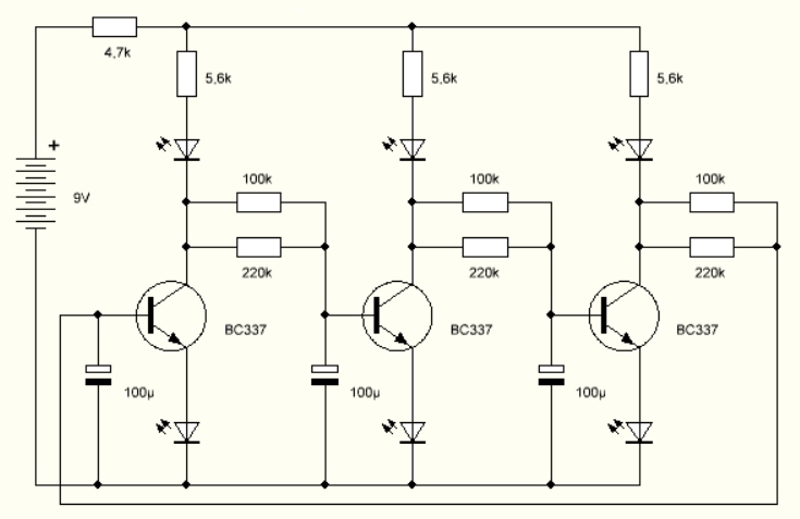 orientiert. In den drei Emitterleitungen müssen gleiche LEDs verwendet