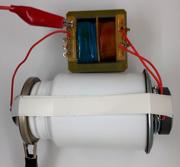 Lautsprecher und Mikrofon an ein Rohr gelegt, eine alte Kaugummi-Dose.