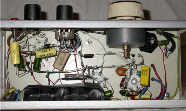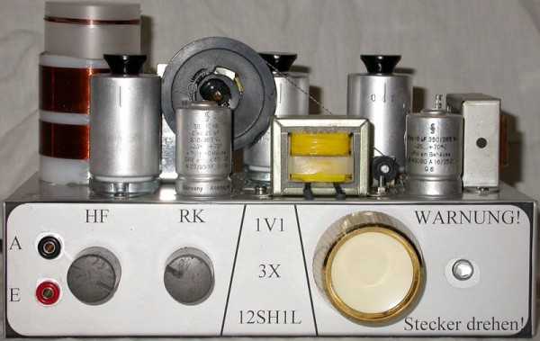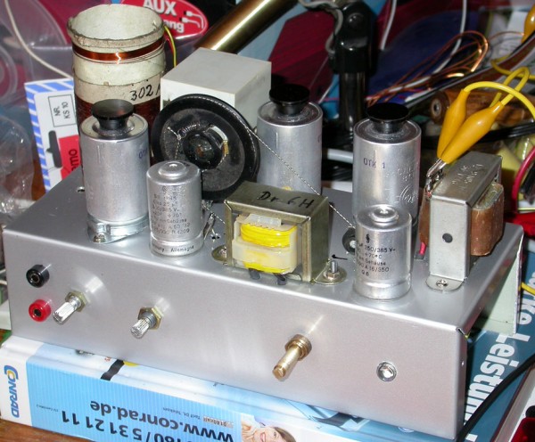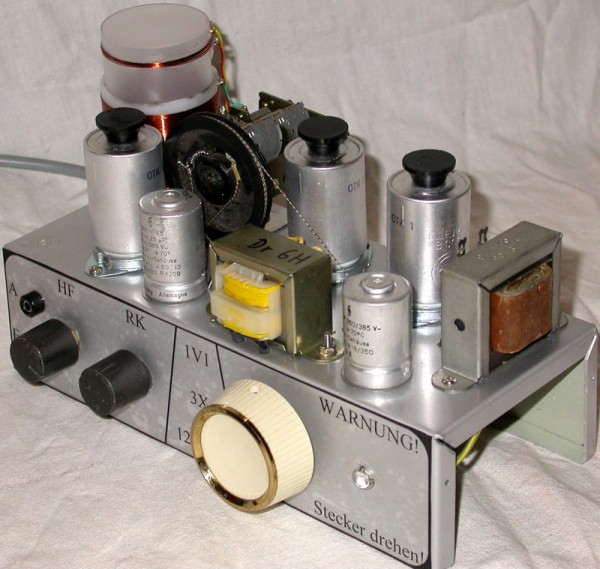 Als relativ schwierig erwies sich die Suche nach der Ursache des Brummens. Hörbar war, dass es sich nicht um Restbrumm der Anodenspannung, sondern um Heizungsbrummen handelte. Zunächst konnte festgestellt werden, dass der Brumm weniger wird, wenn man die Abschirmung der Audion-Röhre zusätzlich auf Masse legt (die schwarze Schraube auf den Röhren ist dazu ideal). Auch die Verringerung des Gitterwiderstandes auf 1Mohm sowie die Abschirmung der Gitterkombination (nun 1MOhm||150pF) brachte eine geringe Verbesserung. Die eigentliche Ursache aber war eine ganz andere: In Röhrengeräten mit Wechselstromheizung findet man meist "Entbrummungsmaßnahmen", teils wird eine Mittelanzapfung des Heiztrafos an Masse gelegt, oder es wird ein "Entbrummer" (Drahtpoti, ca. 200..300Ohm) parallel zu den Röhren geschaltet, Schleifer an Masse. Solche Maßnahmen sind hier bei Reihenschaltung und Vorkondensator nicht ohne weiteres möglich. Rein theoretisch könnte man einen Entbrummer parallel zur Audion-Heizung anbringen, müsste dann aber auch die anderen Röhren mit Parallelwiderständen versehen und den Vorkondensator neu berechnen - viel Aufwand also. Als gangbare Lösung fand sich schließlich eine einfache Maßnahme: der Masseanschluss des Heizkreises muss am Stift 8 der Audionröhre liegen und schon ist kaum noch ein Brumm zu hören (kaum, weil der optimale Massepunkt sicher die Heizfadenmitte wäre, die steht hier aber nicht zur Verfügung. Zu meiner Schande muss ich gestehen, dass es in der Originalschaltung auch so ist, dass der Heizkreis bei Röhre 2 (=Audion) beginnt ....